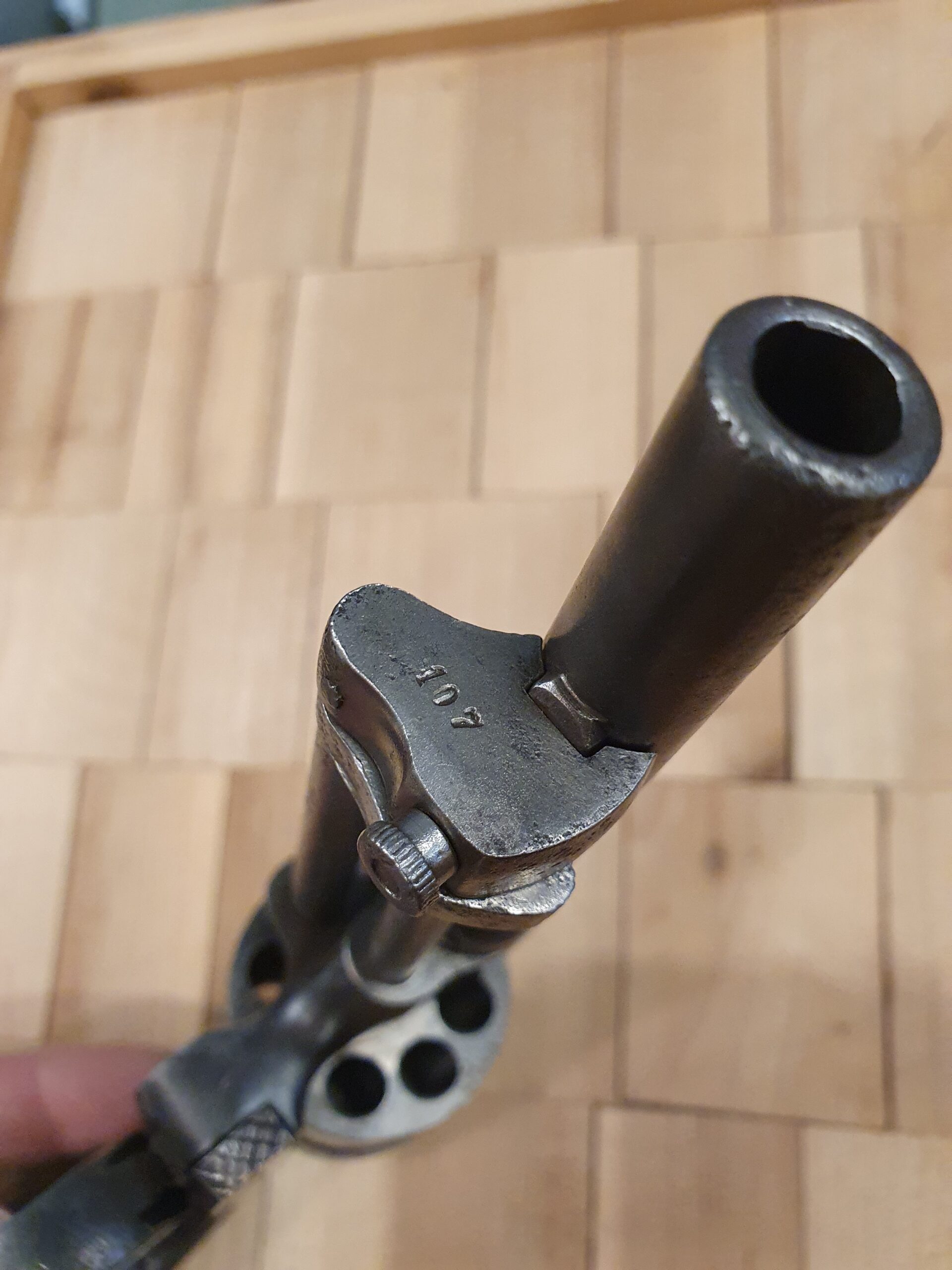 Zustand: Oberfläche narbig, Lauf innen narbig, Züge und Felder ausreichend ausgeprägt.